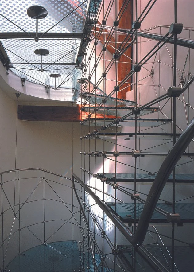 The main reception floor is covered withlimestone tiles continuing way throughto the sleeping area and bathrooms. The bedrooms also have natural timber boards in a centralzone of the floor. Access to the apartment was eventually achieved via the empty lift shaft above the service staircase - originally designed for serving staff to bring food and firewood in to the first floor, without causing any interruptions. As the sandstone walls were not capable of taking any significant loading, the entire glass stair had to be suspended from the trusses from the loft level all the way down to the first floor. The principle of using a glass stair was initiated by the necessity of bringing daylight as deep as possible into the buildingand as a lightweight, translucent structure in a space that could easily feel confined. The articulation of the main space, with its natural geometry and large timber trusses, needed very little in terms of finishing and internal features.
