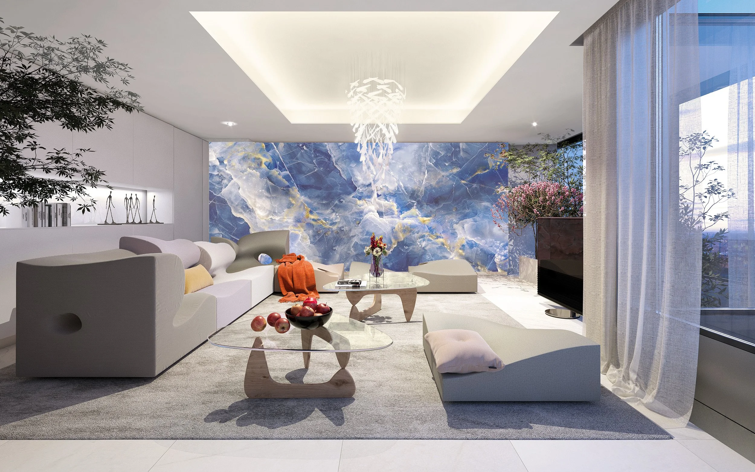 The design emphasizes open, spacious layouts with blue illuminated stone and stainless steel as unifying elements. Panoramic windows provide breathtaking views of Bratislava, while a wraparound terrace offers an ideal space for relaxation or gatherings. The kitchen stands out with designer furniture and a stylish bar, complemented by pendant lights.